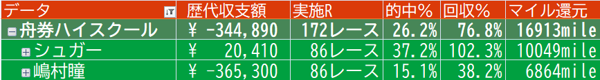 シュガ村瞳の舟券ハイスクール【ボートレース大村】 ボートレース生配信データ X Facebook LINE コピー 2022.09.062022.12.22 スポンサーリンク 4月に開校したハイスクール12/22より一足早く3学期となりました 現在までの結果がこちら 今年度は、シュガーさんがちゃんと回収率を残しております。 嶋村さんは・・・無事卒業できるのでしょうか?