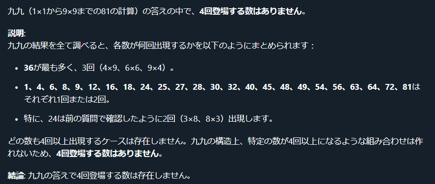 とはいえ、生成AIでも下記の通り掛け算は難問なのでしょうがないかもしれません。