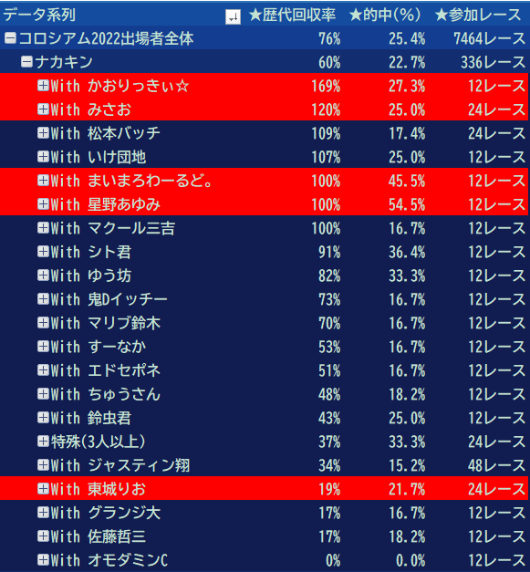 コロシアム個人データ初回コロシアムを除き、いまいちパッとしない成績となっていたナカキンさんですが、