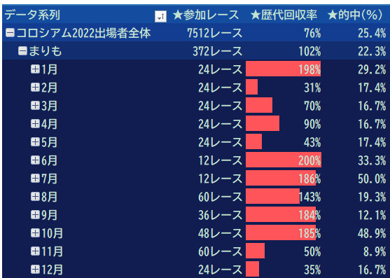 びわこコロシアム個人データ【まりも】 コロシアム個人データ X Facebook LINE コピー 2022.08.102022.08.21 スポンサーリンク 今回はまりもさんのコロシアムデータを見てみます。 目次 相方のデータ 月別データレース別データ 相方のデータ 回収率が高い順に並べてみましたが パチスロ関連の方が上位に来ていることがわかります。 月別データ まりもさんの得意とするの夏から秋 真冬から春先にかけては回収率を落とす傾向 レース別データ 1Rと12Rという勝負所に強い印象